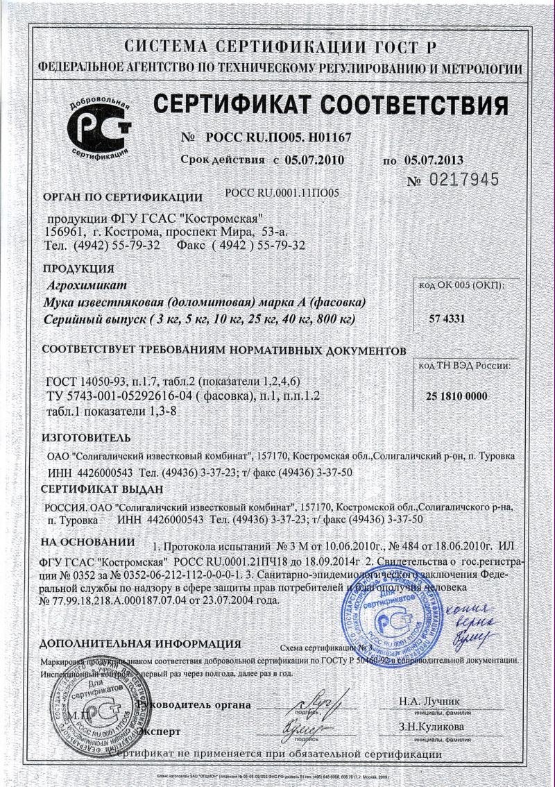 Мука известняковая (доломитовая), марка "А» (пылящая) | ГОСТ 14050-93 (производство), ТУ-5743-001-05292616-04 (фасовка) | № 7803100 от 02.07.2007г. Посмотреть | Фасовка в бумажных мешках или насыпью в ж/д транспорт, автотранспорт | Прайс лист | ||
