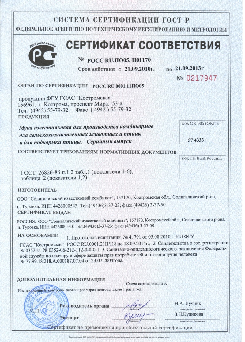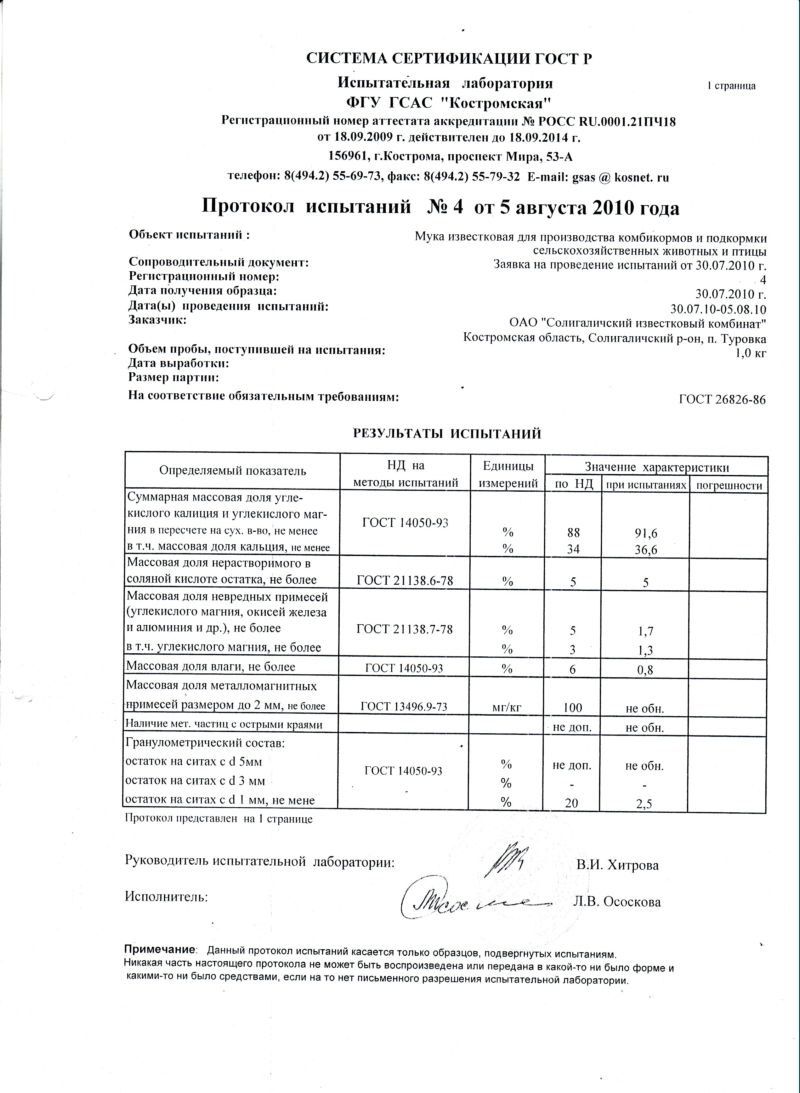 Мука известняковая для производства комбикормов для сельскохозяйственных животных и птицы и для подкормки птицы | ГОСТ 26826-86 | № 0217947 от 21.09.2010г. Посмотреть | Протокол испытаний №4 от 05.08.2010г.: Посмотреть | Фасовка в бумажные, полипропиленовые пакеты (мешки) по 800 кг в МКР, отгрузка автотранспортом и Ж/Д транспортом | Прайс лист |