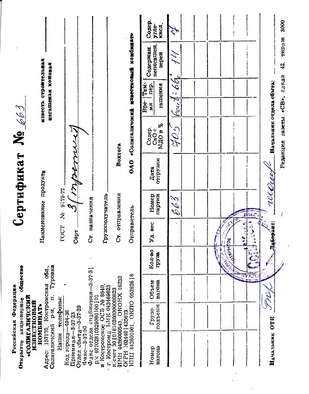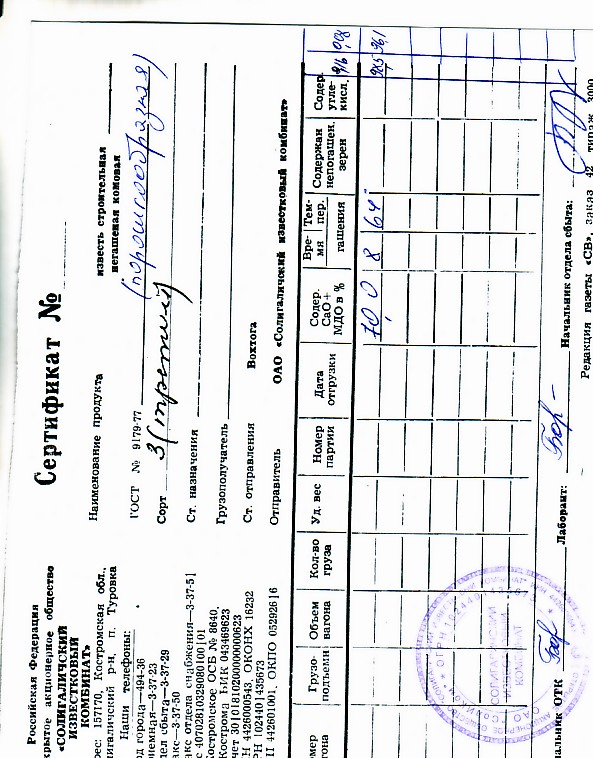 Известь строительная комовая (негашеная) для производства силикатных изделий | ТУ 5744-00205292616-2004 | №0064161 от 30.04.2012 г. Посмотреть | Фасовка в МКР или насыпью в ж/д транспорт, автотранспорт | Прайс лист | ||