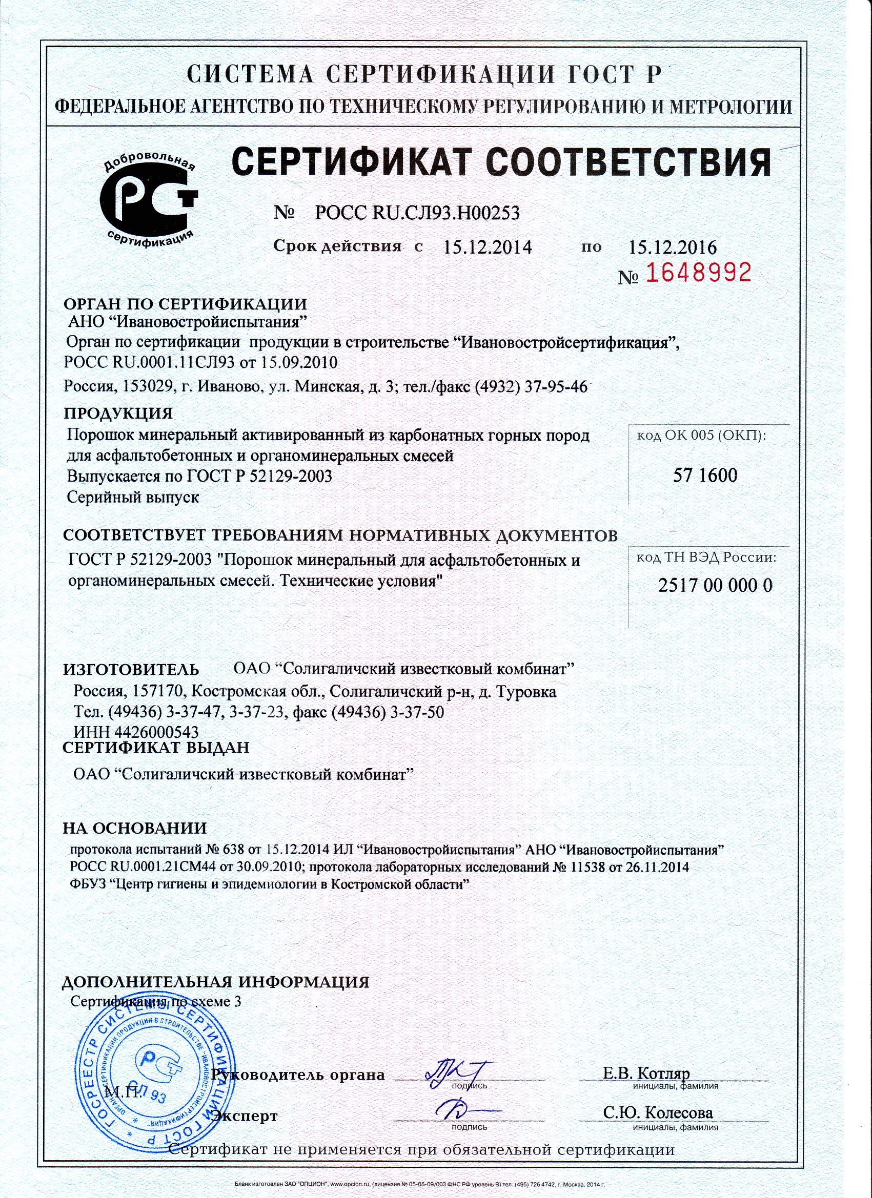 Порошок минеральный активированный для асфальтобетонных и органоминеральных смесей | ГОСТ Р. 52129-2003 | № 060502 от 18.12.2014г. Посмотреть | Фасовка в МКР или насыпью в ж/д транспорт, автотранспорт | Прайс лист | ||